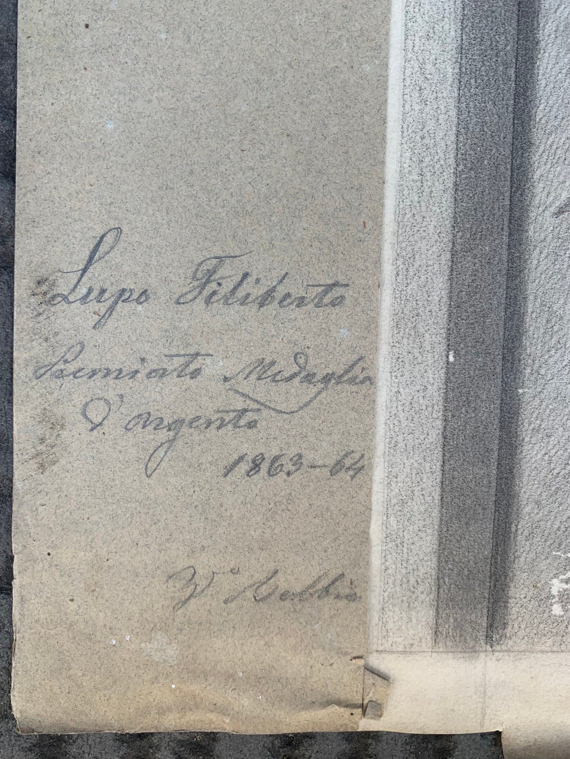 This drawing, which won a silver medal, is signed by the student Lupo Filiberto. Such signatures are rare on academic drawings, highlighting the exceptional prestige of this work. Additionally, the piece features a less legible inscription at the bottom, possibly "Nebbio," which may refer to the class or instructor at the Accademia Albertina.