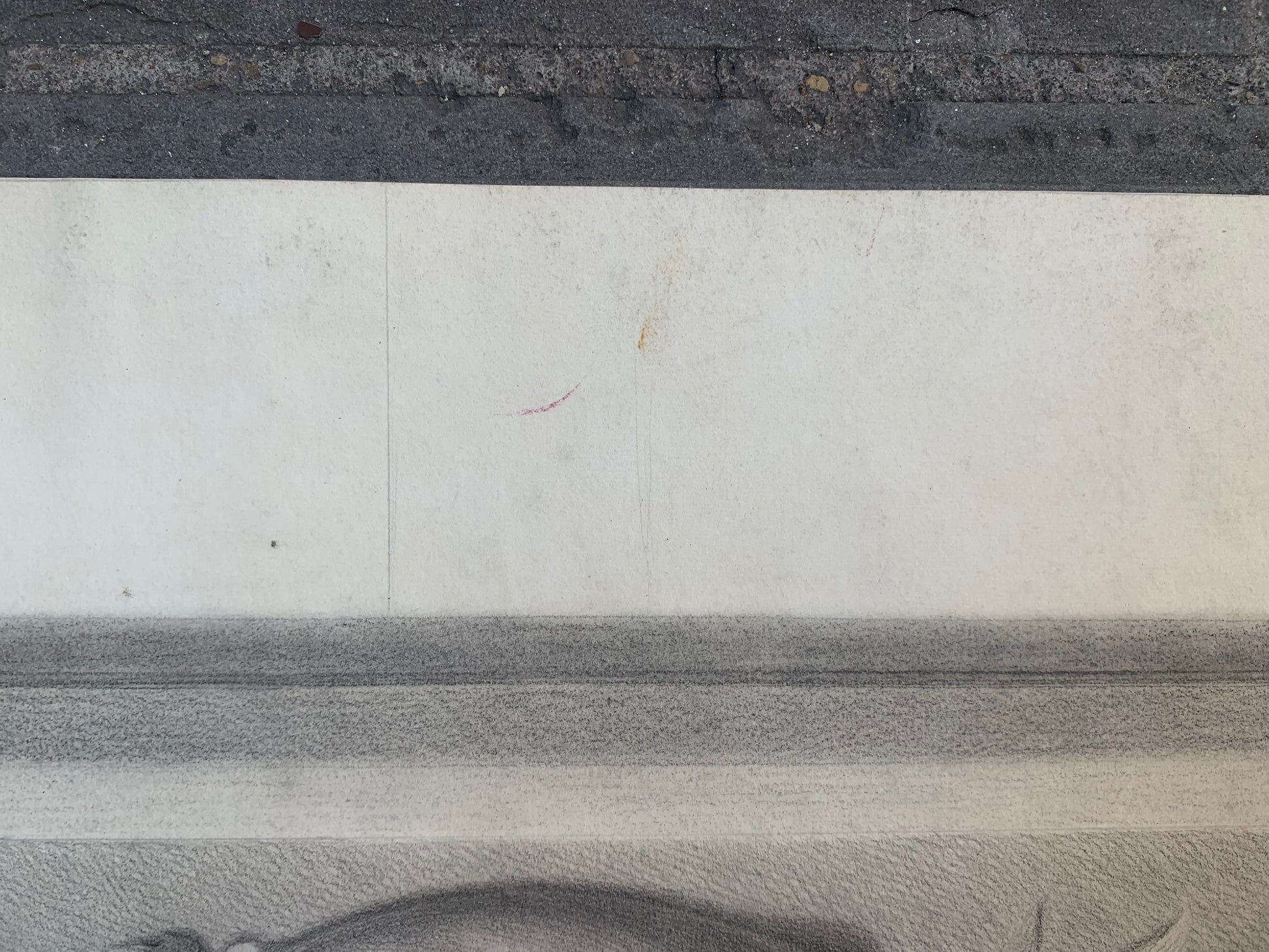 Executed in charcoal on paper, the artwork features an elaborate play of chiaroscuro that creates an almost illusionistic effect. At the lower part of the frieze, two dragons interact gracefully within the composition. The complex design delicately intertwines leaves and small birds, creating a fairytale-like, medieval fusion of natural and mythological elements.
