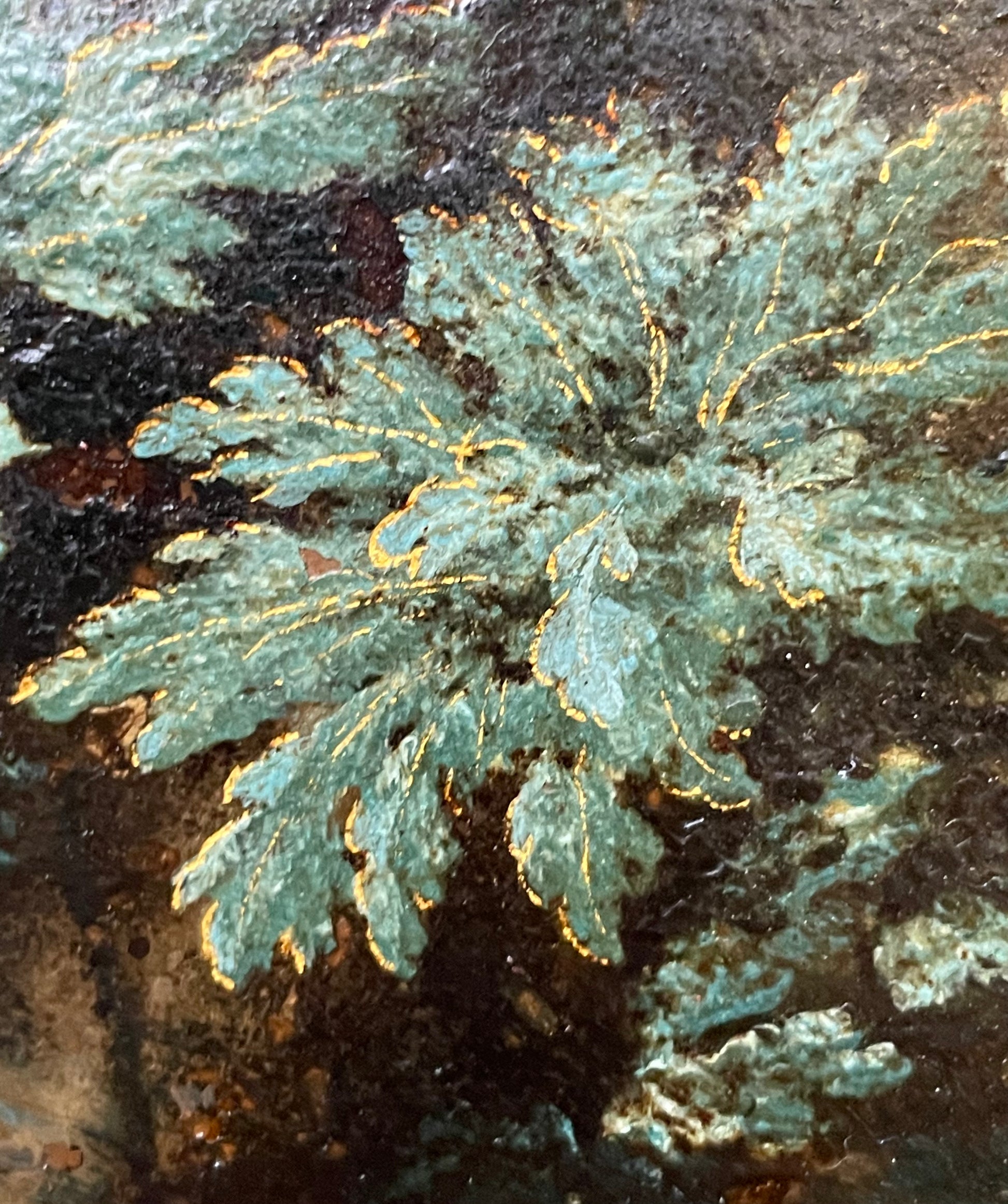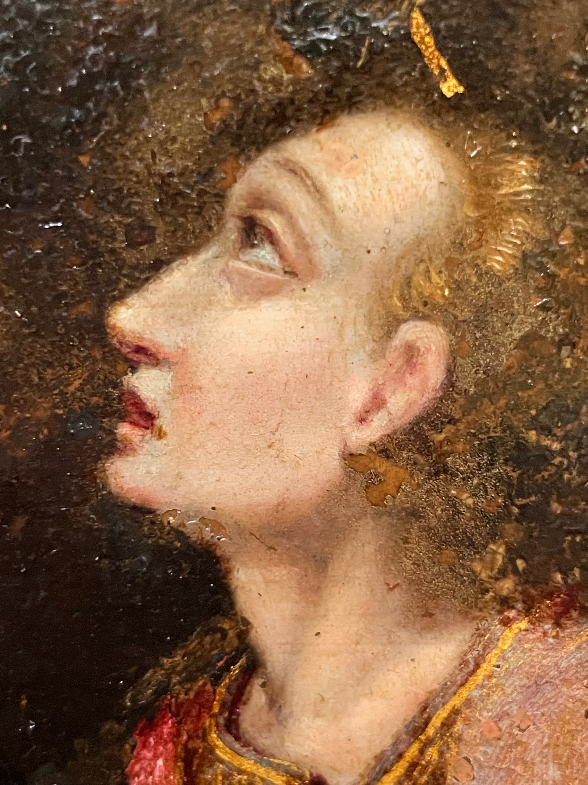 Condition: the Virgin’s robe and some marginal areas show very delicate retouching, due to the naturally lower adhesion of pigments on copper. Overall, the painting preserves an exceptional chromatic vitality and remains in good condition, with its original brilliance largely intact.