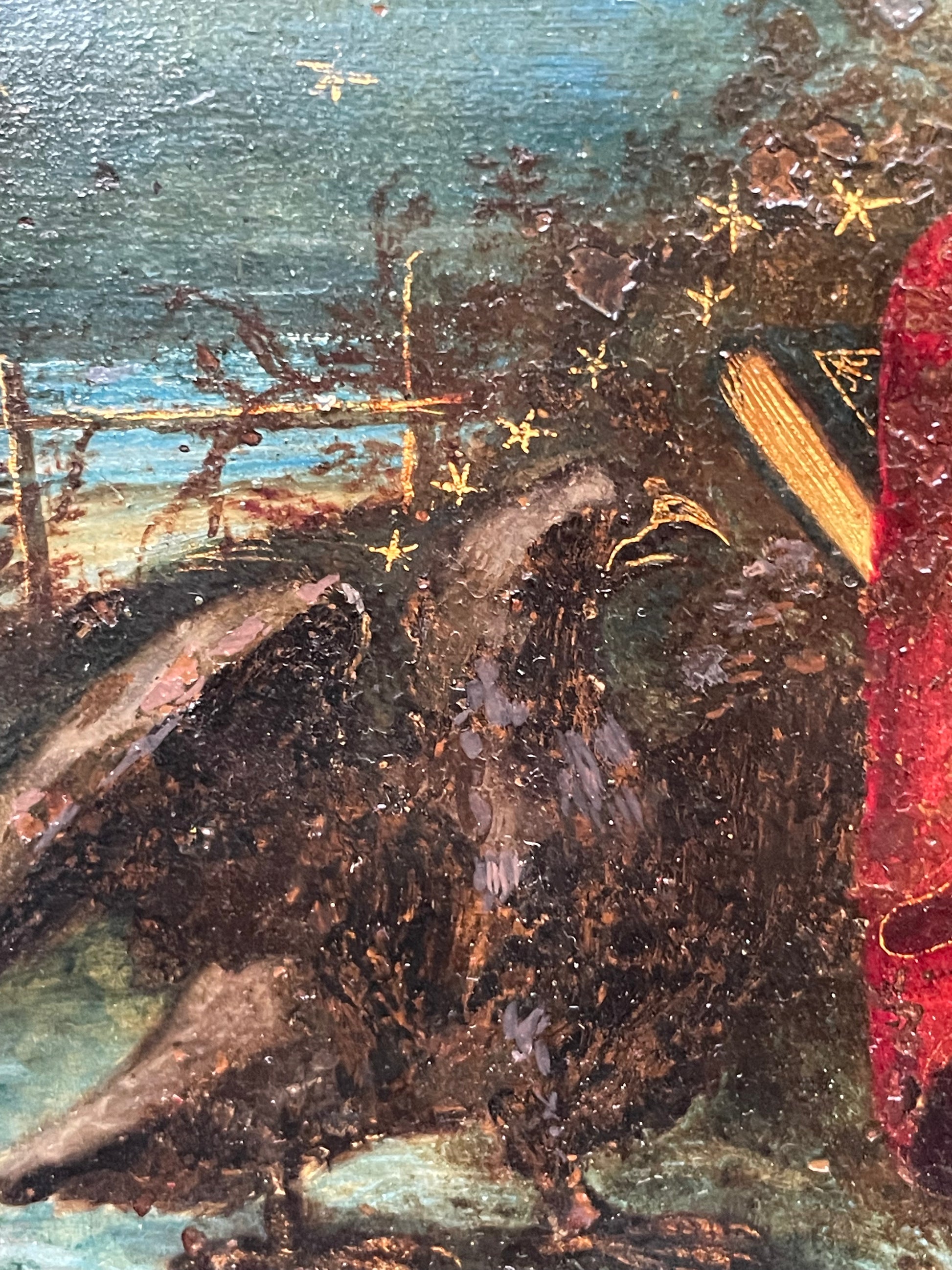 The background with its arched bridge and calm waters blends natural observation and inventive fantasy. The dragon, with its winding and decorative form, adds a mannerist, visionary accent to the sacred vision.