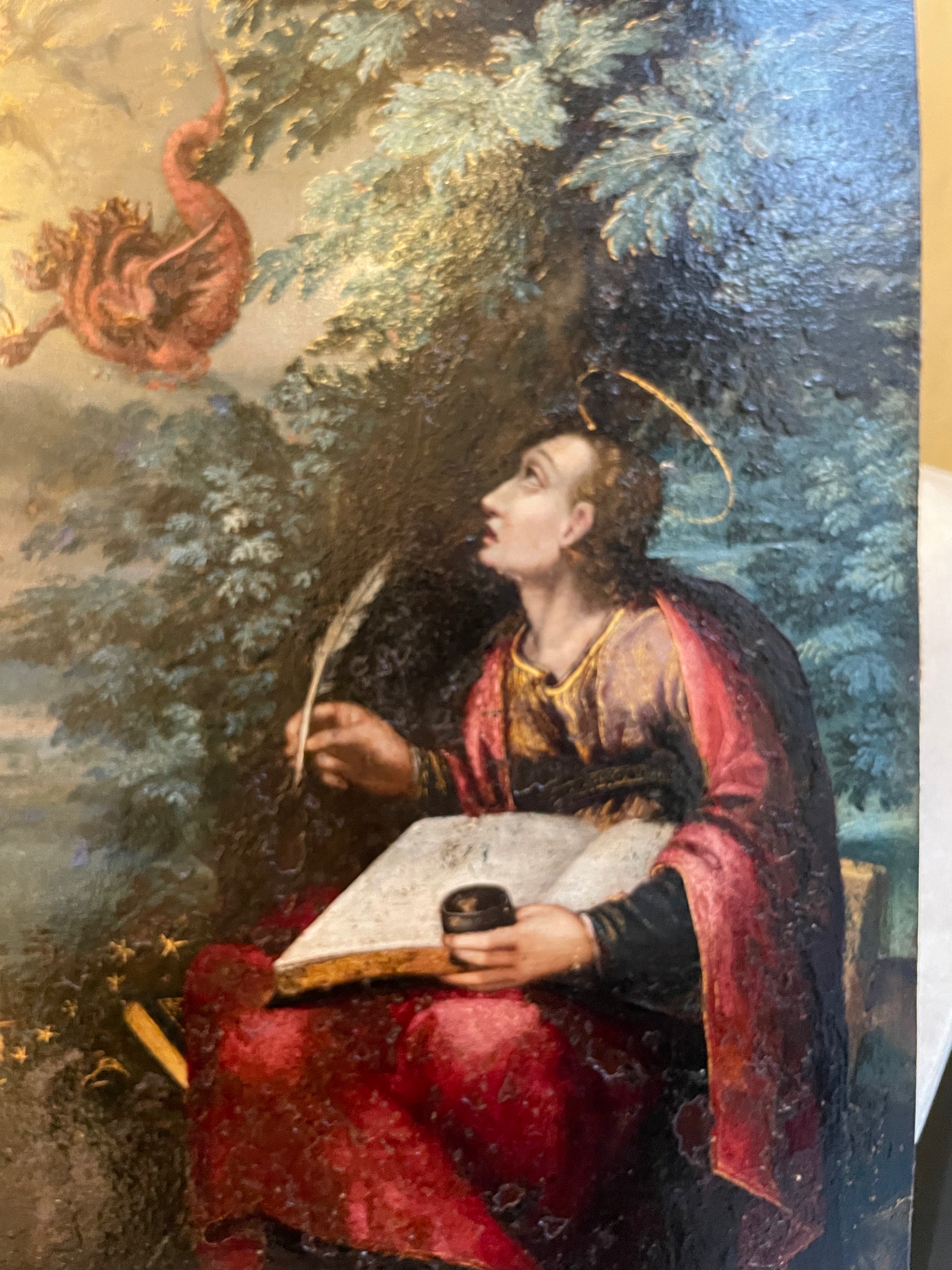 Saint John the Evangelist is depicted seated on the island of Patmos, beside his eagle, writing the Book of Revelation. Above him unfolds the celestial vision of the Virgin “clothed with the sun,” crowned with stars and confronted by the red seven-headed dragon.