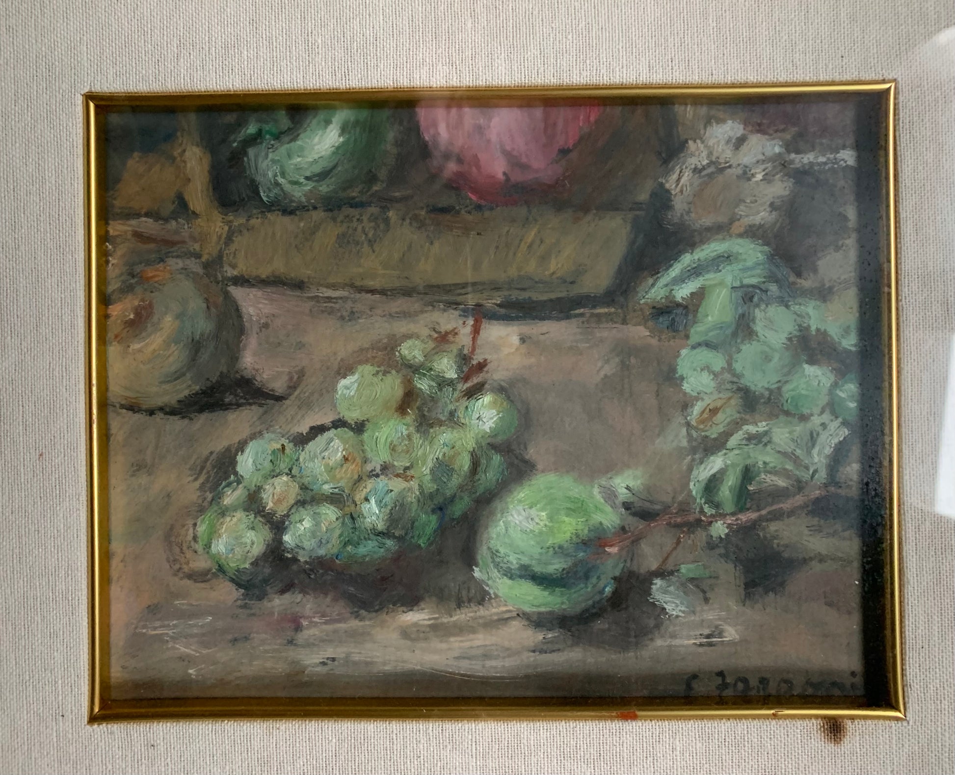 Description: A small oil painting on cardboard depicting a still life dominated by shades of green. Grapes, plums, pears, and a green mushroom – an impossible element in reality – come together in a composition that flirts with the surreal. The green, applied with energetic and expressive brushstrokes, transforms an everyday scene into an imaginative and poetic vision, evoking a unique emotional response in the viewer.