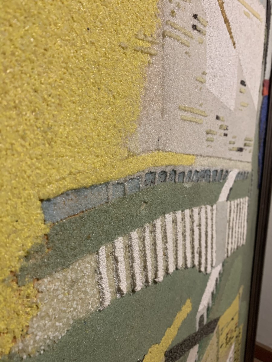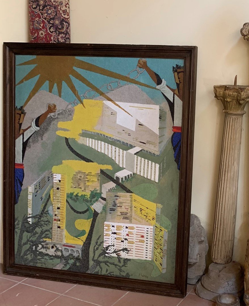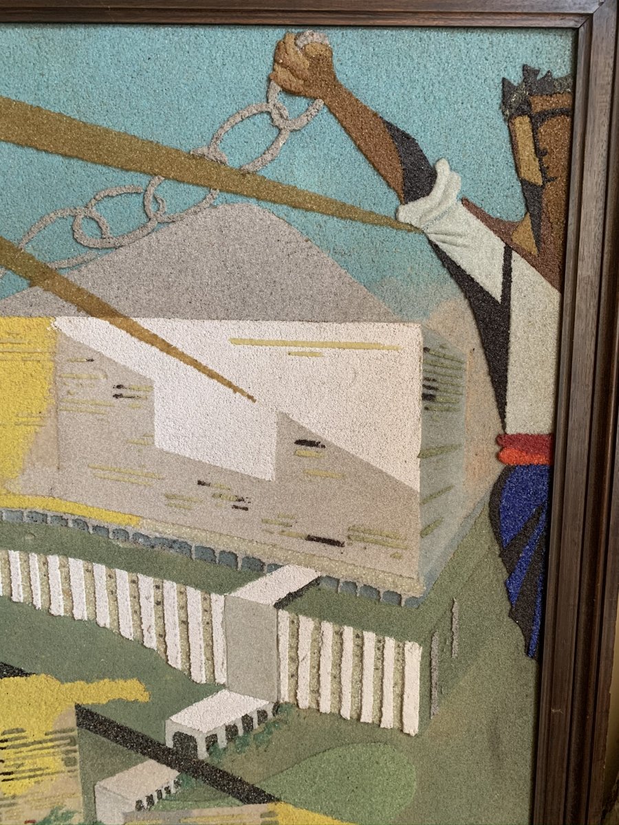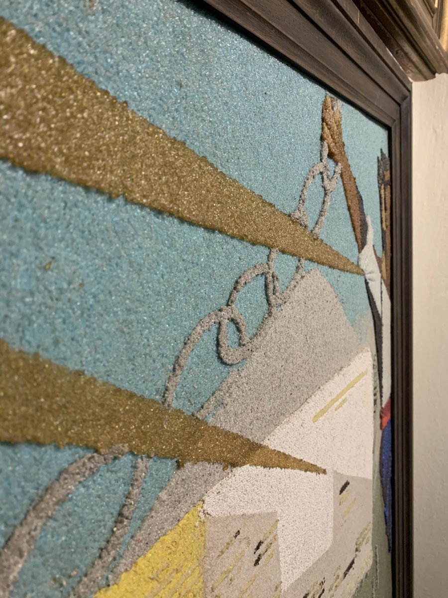 A panel made with an unusual technique. It is the grain of small pieces of colored glass, placed on an adhesive surface, probably in resin, according to a modernist design.