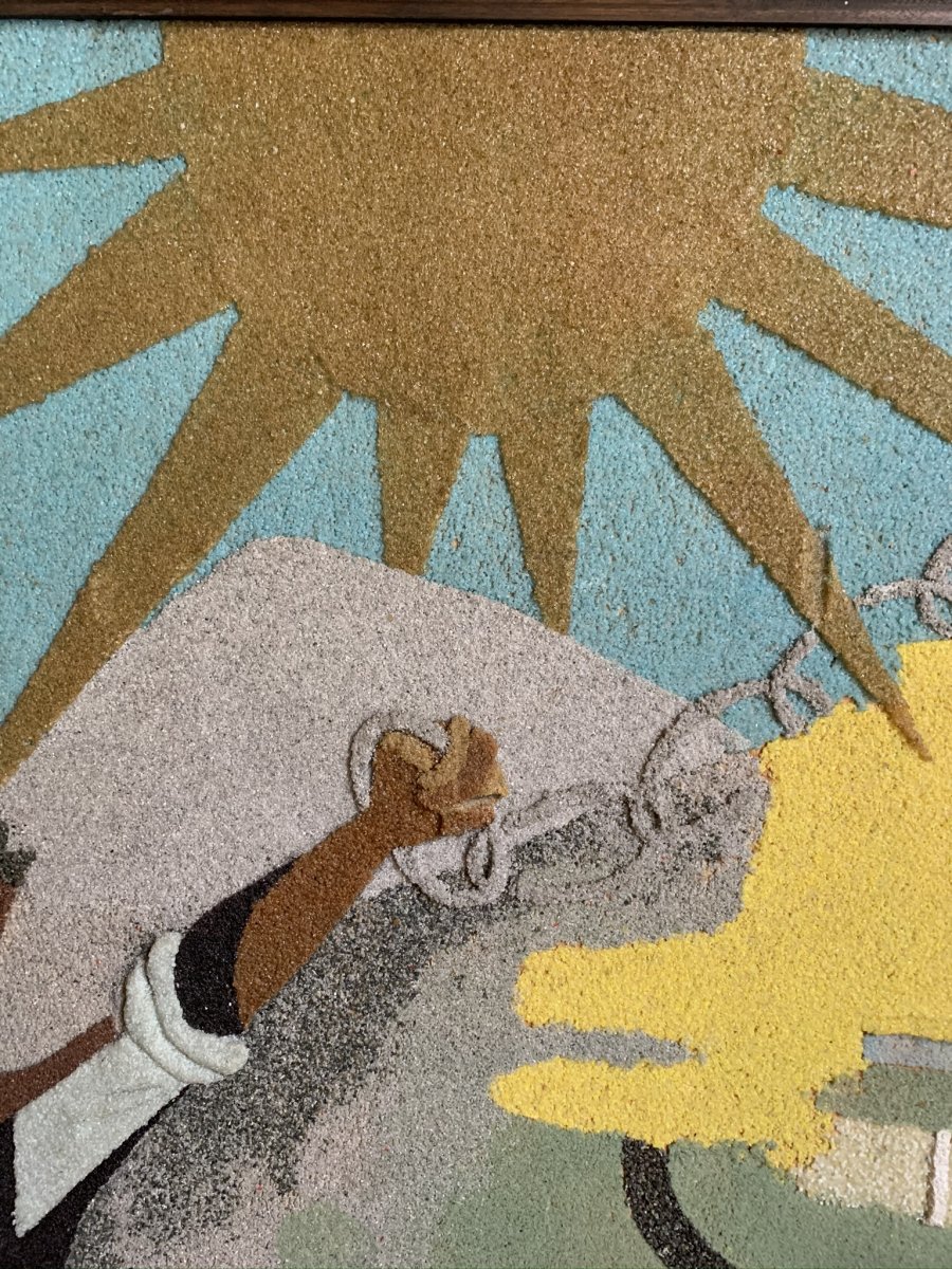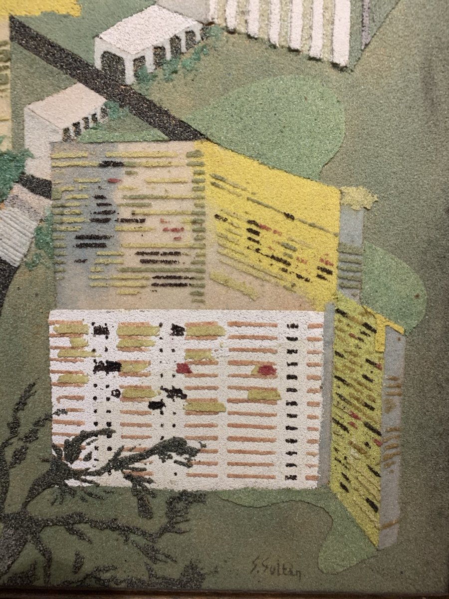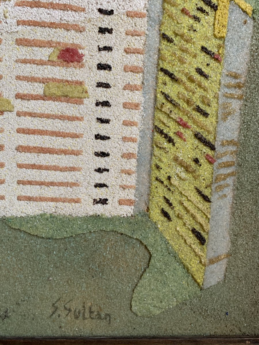 A panel made with an unusual technique. It is the grain of small pieces of colored glass, placed on an adhesive surface, probably in resin, according to a modernist design.