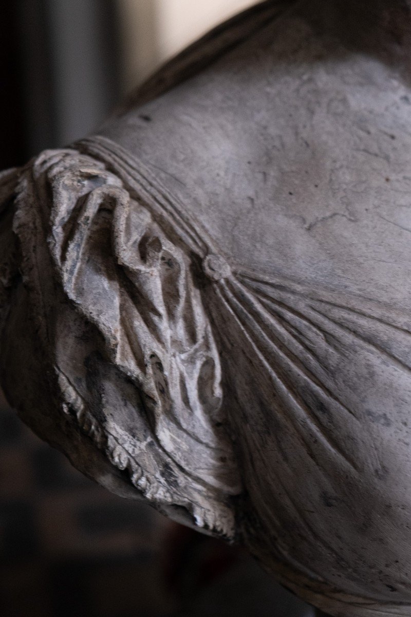 The Neapolitan origin of the two sculptures suggests the probable proximity of the figures to Bourbon environments. Sophisticated lady's hairstyle with double braid, attention to the costume, gives a strict look, but with luxury elements of clothing.