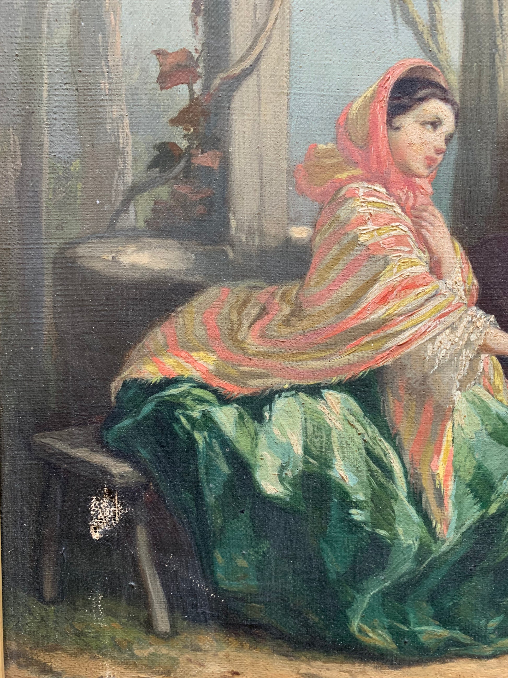 Painting depicting two young women dressed in traditional 19th-century attire, seated next to a well. One figure wears a large striped shawl and a green skirt, while the other, more modestly dressed, holds a white handkerchief. The background features a sparse natural setting and an intimate, contemplative atmosphere, elements characteristic of Gabé's works. The painting showcases a balanced composition with careful attention to light and textile details.