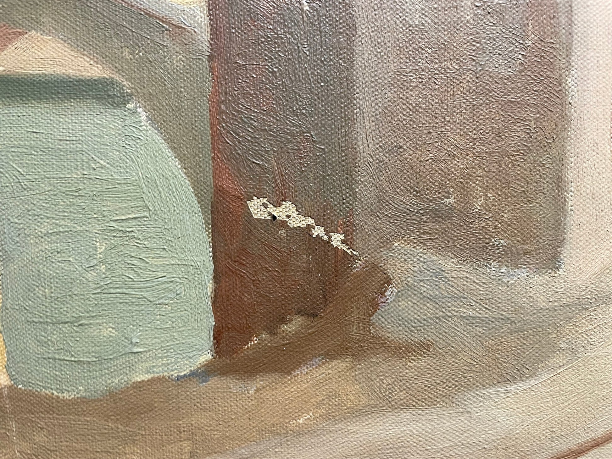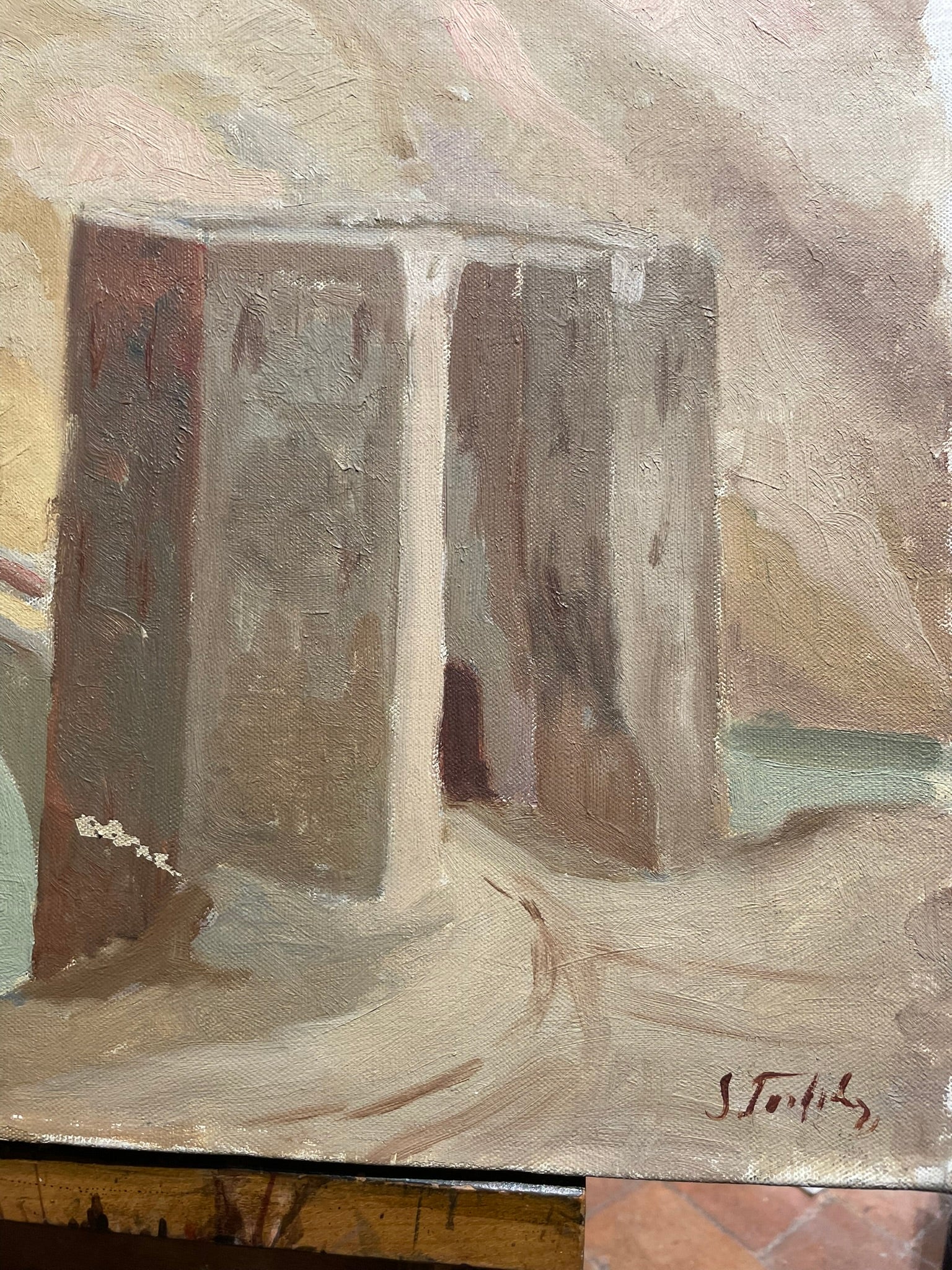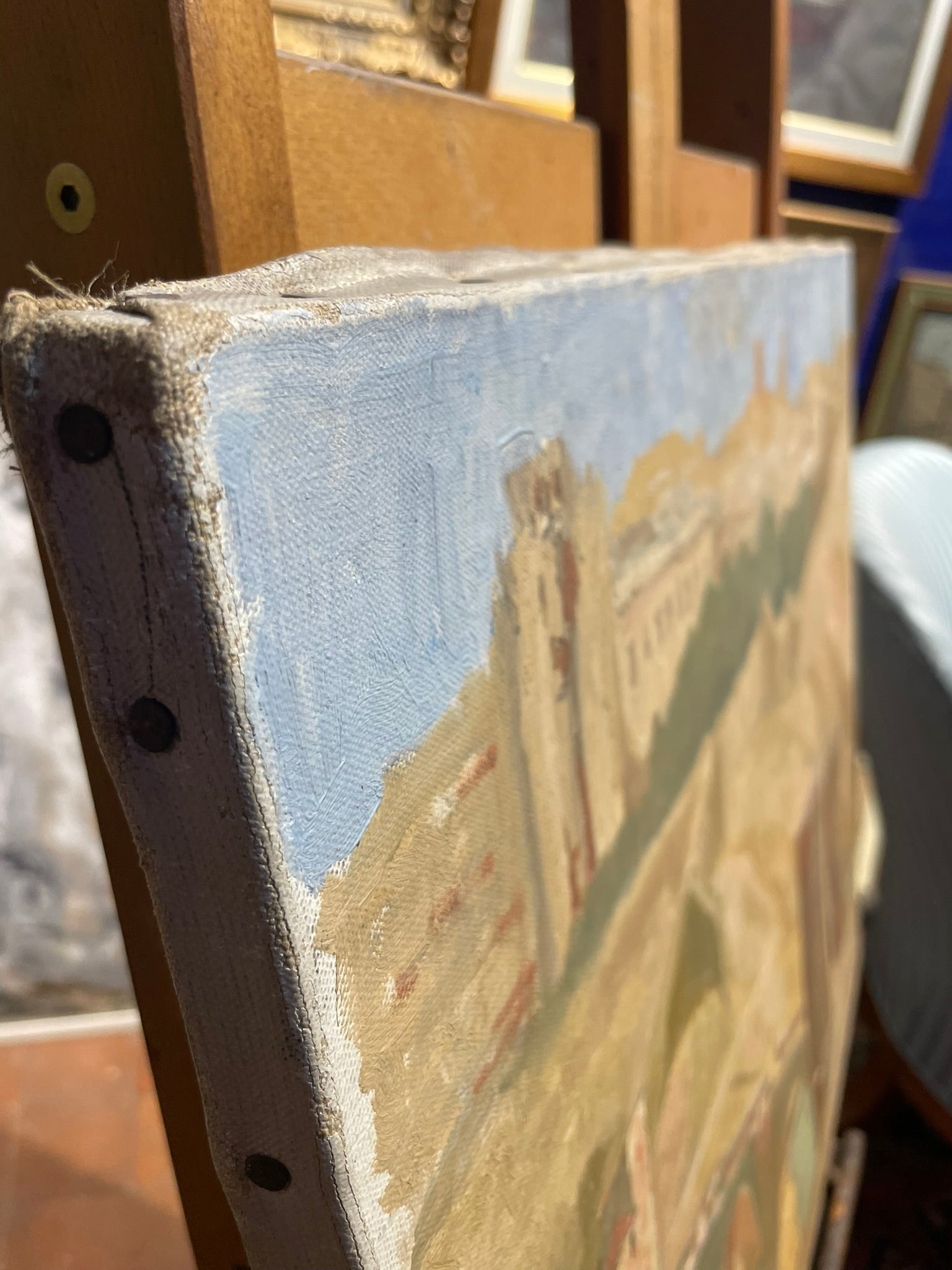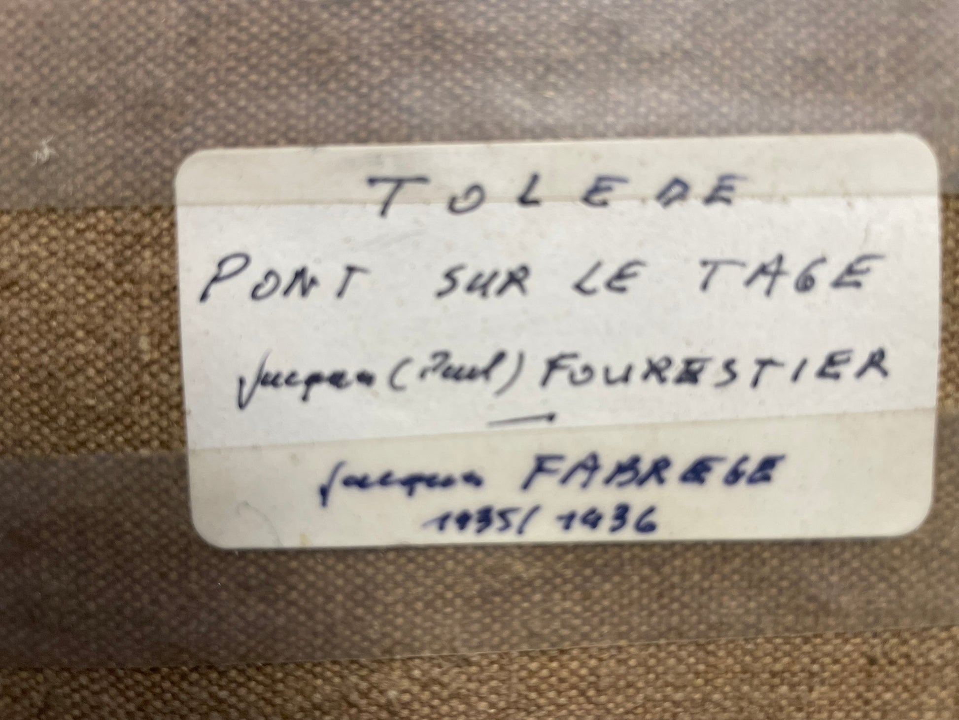 Sul retro è presente una vecchia etichetta manoscritta in lingua francese che indica: “Tolède – Pont sur le Tage”, con datazione “1935/1936” e il nome di un pittore citato come Jacques (Paul) Fourestier; compare inoltre un’ulteriore nota attributiva a “Jacques Fabrege”. Indicazioni da considerarsi come annotazioni di provenienza e catalogazione precedente.