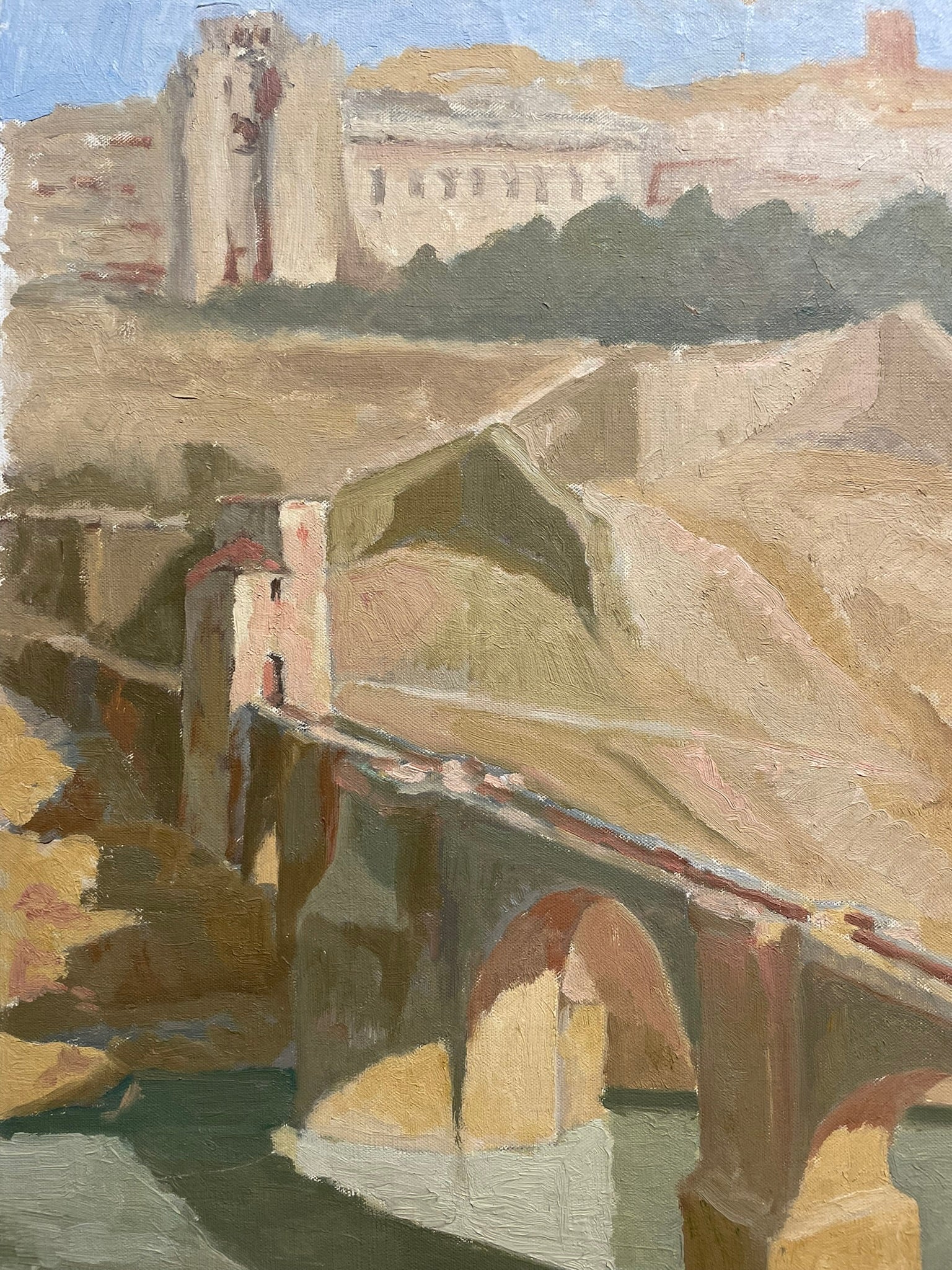 Veduta della città storica di Toledo, in Spagna, con il celebre ponte sul fiume Tago, identificabile con il Puente de San Martín, uno degli accessi monumentali più rappresentativi della città. La composizione restituisce l’atmosfera luminosa e asciutta del paesaggio castigliano attraverso una pittura sintetica, costruita per campiture e tonalità calde, tipica della produzione europea tra le due guerre.